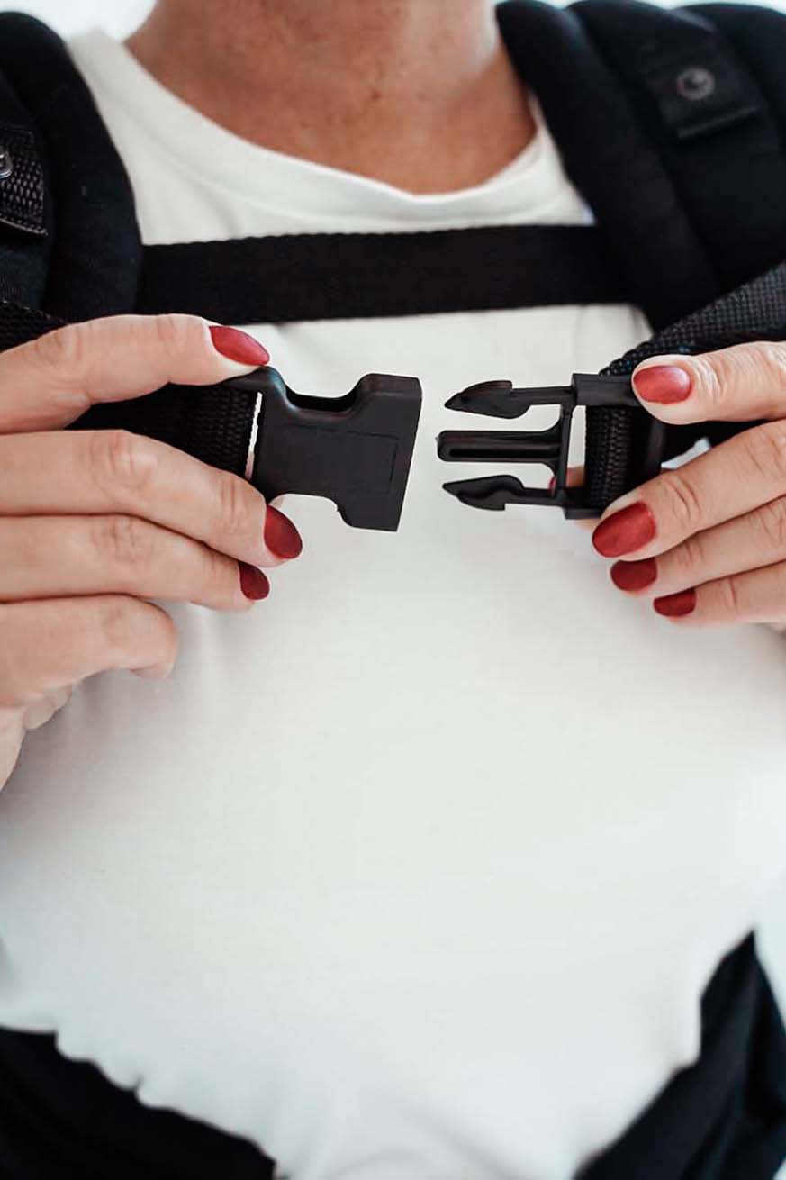 Especialmente diseñado para llevar en la espalda con el nuestro. KOKADI Media hebilla Portabebés me gusta TaiTai, WrapStar y WrapTai, Diseñamos nuestra correa para el pecho con una hebilla. Esto distribuye aún mejor el peso de su bebé y evita que las correas se deslicen sobre su hombro. Ponte el portabebé como de costumbre y apriétalo. A continuación se pasa la correa pectoral a través de las correas y se fija delante del pecho con la hebilla.
