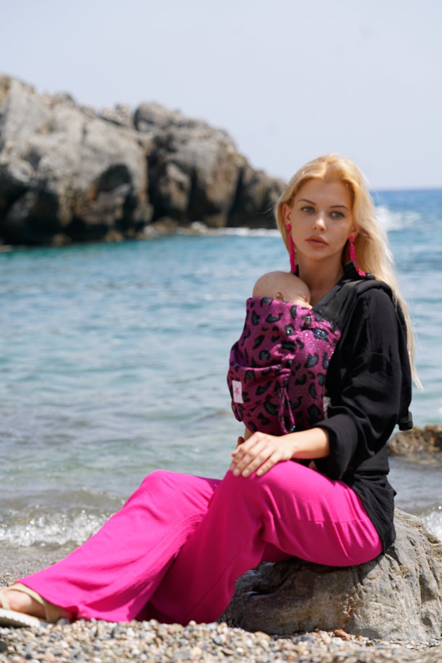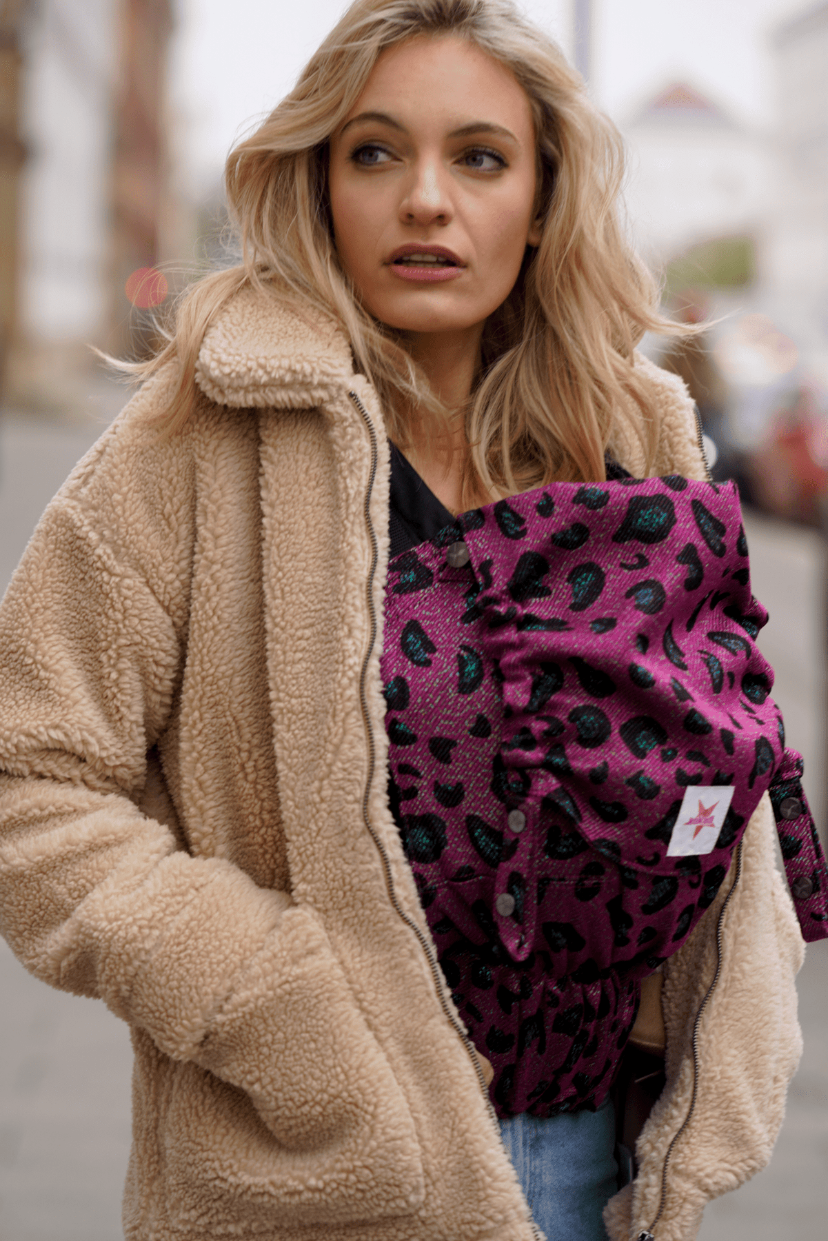 Tejido sedoso y fluido y un moderno estampado de leopardo en rosa brillante intercalado con brillantes hilos de purpurina verde. Este Portabebé hará que tu corazón lata más rápido: ¡eso es Safari Caspar!