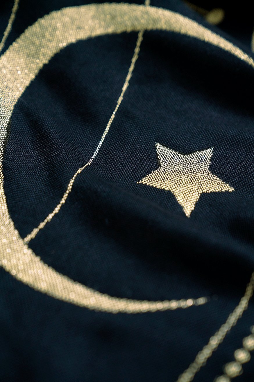 La astrología muestra las fases de la luna. La hermosa y mágicamente suave tela de oro del noble metal es una reminiscencia de nuestro cosmos y el cielo estrellado. El Jaquard Webung de dos capas con hilos negros y dorados se puede admirar desde ambos lados y destellos con las estrellas alrededor de la apuesta. Debido a la ciego acogedor, es perfecto para abrazar a su bebé y también para usted como una bufanda elegante.
